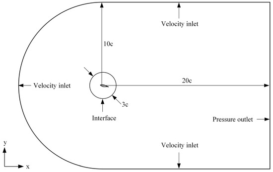 This paper utilized the calculation conditions from the study of Huang et al. [28]. The computation domain and boundary conditions are illustrated in Figure 1. The chord length of the S809 hydrofoil is 200 mm. The computation domain is composed of a semicircle with a radius of and a square with a side length of . The distance from the oscillation center point of the hydrofoil to the leading edge is . The distance from the inlet boundary to the oscillation center point of the hydrofoil is to prevent the inlet boundary from affecting the upstream flow field of the hydrofoil. The distance from the outlet boundary to the oscillation center point of the hydrofoil is , which allows for the full development of the wake. The entire computation domain is divided into a stationary domain and a rotational domain. The size of the rotational domain is . Data between the stationary and rotational domains are transmitted through an interface. The surface of the hydrofoil is set as a non-slip boundary. The boundary conditions of the inlet and outlet are velocity inlet and pressure outlet, respectively. The freestream velocity = 5 m/s and the computational medium is water with a density of 998.2 kg/m3 and a viscosity of 0.001003 kg/(m*s).
