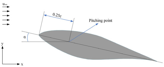 This study referred to the hydrofoil oscillation parameters from Huang et al. [28]. The S809 hydrofoil undergoes sinusoidal pitching oscillations around its quarter chord point, as depicted in Figure 3. The average angle of attack during the pitching oscillation is 8.6195°, and the amplitude angle of the pitching oscillation is 10.35°. The Reynolds number, approximately , was calculated using Equation (7), where represents water density, is the hydrofoil’s chord length, denotes water viscosity, and represents the free-stream velocity.
