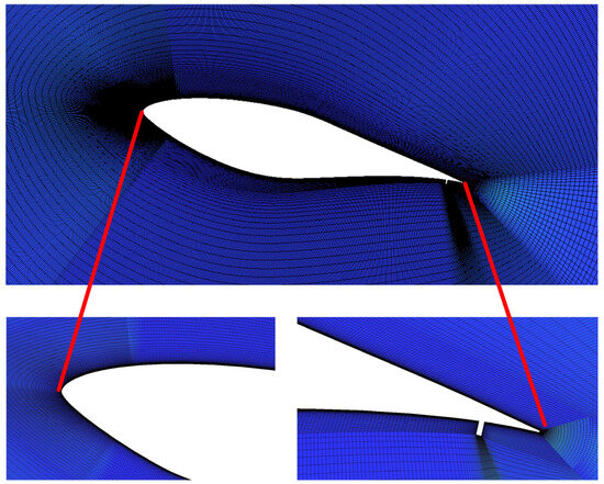 The ICEM 18.0 software was utilized to generate structured grids of the computation domain. The separation regions at the leading and trailing edges of the hydrofoil are particularly sensitive to the value of due to rapid changes in velocity distribution. Therefore, the thickness of the first layer of the grid on the hydrofoil surface is set to , ensuring . Figure 2 demonstrates the grid of the computation domain and provides details of the grid at the leading and trailing edges of the hydrofoil. The numerical simulations in this paper employed a first-order implicit unsteady calculation. The pressure–velocity coupling method used was Coupled, with the pressure discretization format set to Second Order, and the other terms discretized using Second Order Upwind. The k-ω SST turbulence model, which can effectively capture the flow separation on the surface of the hydrofoil, was used to obtain dynamic performance parameters of the hydrofoil during oscillatory motion.