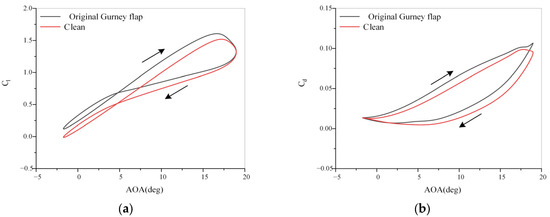 The dynamic coefficient hysteresis loops of the clean hydrofoil and the hydrofoil equipped with the initial Gurney flap: (a) and (b) . (An upward-rightward pointing arrow indicates the hydrofoil’s pitching-up movement, whereas a downward-leftward pointing arrow denotes the hydrofoil’s pitching-down movement.)