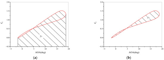 Based on the above research, it can be observed that the Gurney flap effectively enhances the of the hydrofoil during oscillations, thereby improving its dynamic performance. This study aims to investigate the influence of the geometric parameters of the Gurney flap on the dynamic performance of the hydrofoil during oscillations. The following two objective parameters are used to characterize the dynamic performance of the hydrofoil: the area enclosed by the curve during the upstroke phase and the coordinate axis (), and the area enclosed by the hysteresis loop of the hydrofoil within one oscillation period (), namely, the area of the shaded part in Figure 7. These parameters can quantify the dynamic performance of the hydrofoil during oscillations. The area of the t hysteresis loop quantifies the fluctuation of lift during oscillations, while the area enclosed by the curve during the upstroke phase and the coordinate axis quantifies the enhancement of lift provided by the Gurney flap. By quantifying the dynamic hydrofoil performance, a fitting relationship between design variables (four geometric parameters) and objective parameters can be established, and then the optimal geometric parameters for the Gurney flap can be obtained through a genetic algorithm. In subsequent studies, the two objective parameters and are represented as y1 and y2, respectively, for simplicity. The entire optimization process is illustrated in Figure 8.