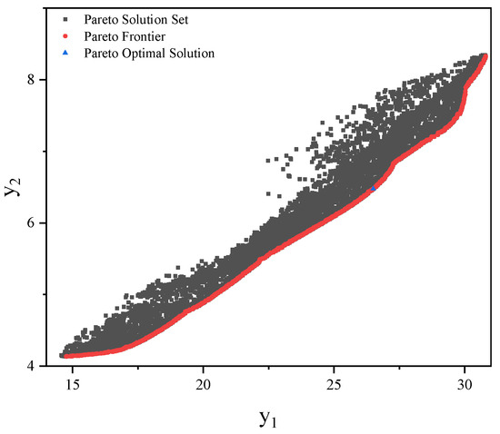 Table 6 presents four error analysis methods applied to approximation models of the two objective parameters. The average error, maximum error, and root mean square error can quantify the differences between the predicted values of the model and the sample points. It is evident that these errors for both objective parameters are significantly lower than the acceptable standards. The determination coefficient gauges the fit between the approximation model and the sample points. For both objective variables, the , indicating the high reliability of the selected approximation model. Therefore, the Kriging model can effectively fit the relationship between design variables and the objective parameters.