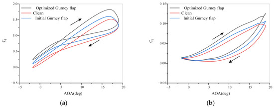 Simulating the sinusoidal pitching oscillations of the clean hydrofoil and the hydrofoil equipped with the initial Gurney flap can obtain the dynamic performance coefficients of the hydrofoils. As shown in Figure 6a, the of the hydrofoil equipped with the Gurney flap is enhanced compared to the clean hydrofoil during both the upstroke and downstroke phases. During the upstroke phase, the of the hydrofoil equipped with the Gurney flap shows a generally consistent increase within a small range of angle of attack compared to the clean hydrofoil, but a relatively small increase within a large range of angle of attack. During the downstroke phase, the increase in the is generally consistent with that during the upstroke phase, indicating that the majority of the hysteresis loop of shifts toward the positive direction of the ordinate under the influence of the Gurney flap. The influence of the Gurney flap on the is depicted in Figure 6b. The impact of the Gurney flap on the differs somewhat from its effect on the . Although it overall increases the , the increase is not a predominantly shifting hysteresis loop but rather a clockwise rotation close to the minimum angle of attack during the oscillation. A comparison of the dynamic parameters of the hydrofoil indicates that the Gurney flap can effectively enhance the during oscillations and improve the dynamic performance of the hydrofoil.