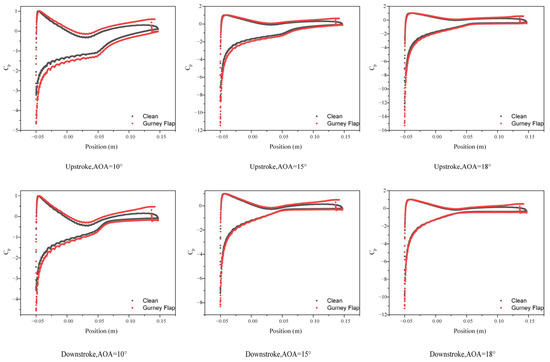 Figure 13 presents the distribution of the surface pressure coefficients for the clean hydrofoil and the hydrofoil equipped with the optimized Gurney flap at different angles of attack during the upstroke and downstroke phases. Within a small range of angle of attack, there is a significant increase in the on the pressure side and a noticeable decrease on the suction side of the hydrofoil, leading to an amplified pressure difference between the pressure and suction sides and enhancing the carrying capacity. The of the hydrofoil is obtained by numerical integration of the pressure over the area enclosed by the pressure distribution curve in the graph, where a larger area corresponds to a greater lift generated by the hydrofoil. Within a large range of angle of attack, there is a relatively small increase in the on the pressure side of the hydrofoil and a small decrease on the suction side. However, the pressure difference between the two sides still increases, explaining the reduced lift enhancement effect within a larger range of angle of attack compared to the effect within a smaller range. It can be observed that, at angles of attack of 10° and 15°, the pressure difference between the two surfaces of the hydrofoil during the upstroke is greater than during the downstroke, resulting in a more significant increase in the during the upstroke. As the pressure difference between the two surfaces of the hydrofoil vary at different angles of attack, the of the hydrofoil experiences varying degrees of improvement throughout the entire range of angle of attack, resulting in an overall enhancement of the of the hydrofoil throughout the entire range of angle of attack.