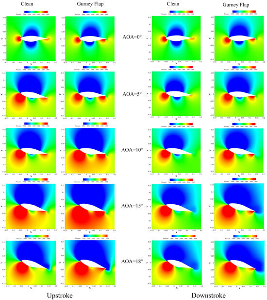 Figure 14 illustrates the pressure distribution contours of the clean hydrofoil and the hydrofoil equipped with the optimized Gurney flap at different angles of attack during the upstroke and downstroke phases. It can be observed that, with an increase in the angle of attack during the upstroke phase, the low-pressure region on the pressure side gradually transitions into a high-pressure region, and the area of the high-pressure region gradually increases. The installation of the Gurney flap causes compression of the flow near the trailing edge of the hydrofoil, resulting in the appearance of a high-pressure region near the trailing edge, and the overall pressure on the pressure side increases as the angle of attack increases. The rear of the Gurney flap becomes a negative pressure region, leading to an increase in the drag and explaining the increase in the drag coefficient within a certain range of angle of attack. The low-pressure region on the suction side gradually extends toward the trailing edge as the angle of attack continues to increase, and the low-pressure region of the hydrofoil equipped with the Gurney flap converges with the low-pressure region behind the Gurney flap. The increasing area of the low-pressure region on the suction side effectively increases the effective curvature of the hydrofoil, thereby increasing the pressure difference between the upper and lower surfaces of the hydrofoil, consequently enhancing its carrying capacity. The pressure distribution contours of the hydrofoil during the downstroke phase are similar to that during the upstroke phase, explaining the varying degrees of improvement throughout the entire range of angle of attack.