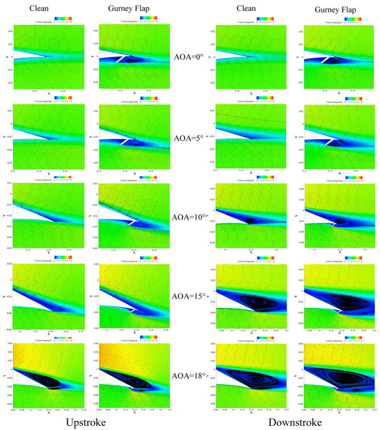 Figure 15 depicts the streamlines of the flow field and velocity contours for the clean hydrofoil and the hydrofoil equipped with the optimized Gurney flap at various angles of attack during the upstroke and downstroke phases. For small angles of attack during the upstroke phase, the flow field around the clean hydrofoil remains attached to the surface, while the hydrofoil equipped with the optimized Gurney flap generates vortices near the Gurney flap. The upstream vortex on the Gurney flap leads to decreased velocity and increased pressure on the pressure side of the hydrofoil, while the downstream region exhibits a strong counterclockwise vortex resulting in reduced pressure and increased suction, ultimately increasing the lift. This is also supported by the pressure distribution in Figure 13. As the angle of attack increases, these vortices gradually diminish and dissipate. At an angle of attack of 18°, severe flow separation occurs. It can be observed that both the clean hydrofoil and the hydrofoil equipped with the optimized Gurney flap exhibit two vortices of opposite directions at their trailing edges. The counterclockwise vortex at the trailing edge of the hydrofoil equipped with the optimized Gurney flap is larger than that of the clean hydrofoil, leading to a larger negative pressure area and a significant increase in drag for the hydrofoil at the high range of angle of attack. During the downstroke phase, as the angle of attack decreases, the vortices near the hydrofoil’s trailing edge diminish, and the flow separation gradually disappears.