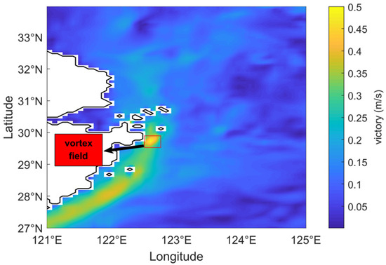 The numerical model of HYCOM (Hybrid Coordinate Ocean Model) is used for the study of the marine environment and plays a crucial role in global ocean research [19]. In this paper, we have chosen the HYCOM+NCODA Global 1/12 Analysis (GLBa0.08) data version (https://tds.hycom.org/thredds/catalogs/GLBv0.08/expt_93.0.html (accessed on 12 April 2024)) from its experimental versions to obtain ocean current velocity data. The data are gridded using the anatomic Mercator-curvilinear HYCOM horizontal grid with a spatial resolution of 1/12° × 1/12°. As shown in Figure 1, a significant vortex field exists in the northern part of Zhoushan Island, Liangheng Island, near Barley Straw Reef, where the flow field is complex and the velocity is high. This vortex field is taken as an example, and the radial basis function is used to obtain its continuously varying velocity distribution using HYCOM model oceanographic data.