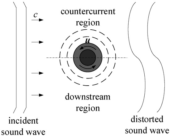 The propagation of acoustic waves in a vortex field is accompanied by changes in amplitude and phase due to the motion of the vortex field. In Figure 2, the vortex field is regarded as a variable speed medium; in the countercurrent region, the direction of acoustic wave propagation is opposite to the direction of vortex medium movement, the speed of acoustic propagation decreases, the intensity of acoustic signals is enhanced, and the phase lag and the downstream region are opposite to it. The deformation of the acoustic wavefront caused by the vortex field carries information about phase changes that can reflect the morphological characteristics of the vortex field. This provides a theoretical basis for the monitoring of vortex fields.