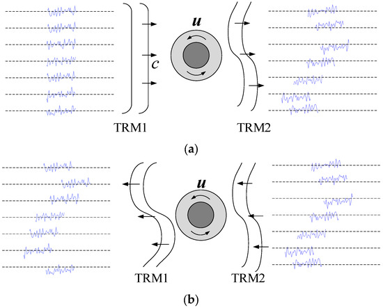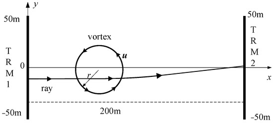 During the numerical simulation, the acoustic frequency of the sound source was set to f = 35 KHz. As shown in Figure 6, 60-element sensors were arranged at equal spacing at both the TRM1 and TRM2 ends. These sensors transmitted planar acoustic waves and received acoustic signals passing through the vortex field. The array elements of the transmitting and receiving arrays were uniformly distributed at a spacing of 1 m. The horizontal coordinate of the TRM1 array was set to x = 0 cm, and the vortex nucleus characteristic radius was denoted by r. The spacing of the TRMs array was D = 200 m, and the ambient sound velocity in the water was set to c = 1500 m/s.