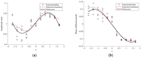Experimental fitting and numerical simulation results of acoustic signals at different locations (the x-coordinate is normalized by the vortex characteristic radius). (a) Amplitude ratio; (b) phase difference.