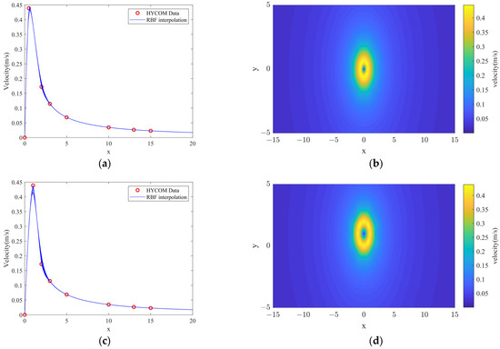 Using the HYCOM marine ambient velocity as a sample point, the velocity distribution of the Barley Straw Reef vortex field can be obtained based on radial basis function interpolation. The coordinates of the vortex core center are set to be (0,0) and (0,10) for simulation conditions I and II after the normalization of the vortex core characteristic radius, and the vortex core characteristic radius is 5 m and 10 m, respectively. Figure 9 shows the tangential velocities and velocity distributions with different radii originating from the vortex core center under both simulation conditions (the coordinates are normalized by the vortex characteristic radius). A comparison was made between the interpolated vortex field velocity values, as shown in Figure 9a,c, and the HYCOM data values, which reveals that the radial basis interpolation function can accurately capture the vortex field velocity distribution.