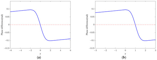 Phase difference curves of acoustic signals in the vortex current field (the y-coordinate is normalized by the vortex characteristic radius). (a) Simulation condition I; (b) simulation condition II.