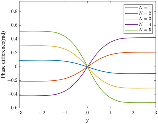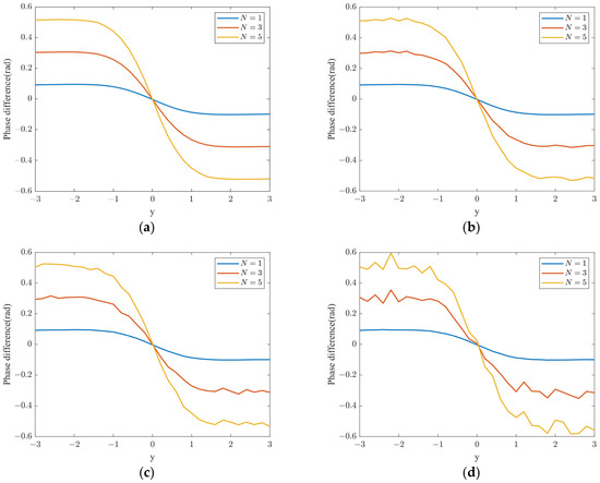 The phase difference of the vortex acoustic signals received by the TRMs with different numbers of simultaneous inversions is numerically simulated under simulation condition I, as described in Section 4.1.1 as an example. The results are shown in Figure 11, where N denotes the number of times the acoustic signals pass through the vortex field.