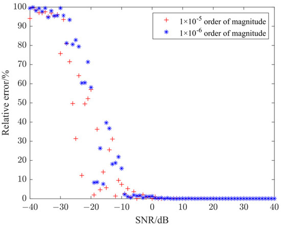 The TRM amplifies the phase change of the vortex field acoustic signal, resulting in an increase in the time delay magnitude after multiple time-reversals. For instance, in the simulation condition I described in Section 4.1.1, the time delay τ is approximately 10−6 with a time-reversal number of N = 1. However, after N = 5 time-reversals, the time delay τ increases to approximately 10−5. To evaluate the accuracy of the time delay estimation algorithm, the delay data errors are calculated at different signal-to-noise ratios for N = 1 and N = 5 time-reversals, as shown in Figure 13.