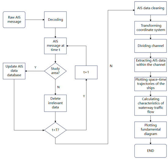 This study required the preprocessing of AIS data in order to implement the plotting process and method of the fundamental diagram of waterway traffic flow suggested in this paper. The preprocessing of AIS data consists of three steps: filtering the AIS data of the waterways, establishing the channel coordinate system, and converting the latitude and longitude coordinates.