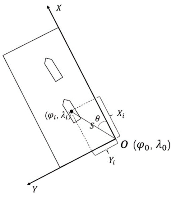 Through the Mercator projection method and the trigonometric relationship, the position of the AIS data points in the Cartesian coordinate system of the channel can be calculated. Figure 3 displays the schematic diagram illustrating the process for transforming latitude and longitude coordinates into Cartesian coordinates.