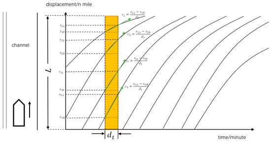 To analyze the fundamental diagram of traffic flow, it is necessary to first establish the defining characteristics of waterway traffic flow. Utilizing the principles and methods derived from the theory of road traffic flow, the space–time trajectory diagram of vessels in a canal was employed to analyze the characteristics of waterway traffic flow [8]. This approach is illustrated in Figure 5. The following formulas describe the relationship between the flow q, speed v, and density k of waterway flow:
