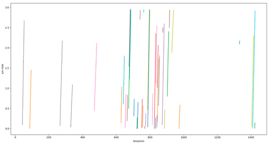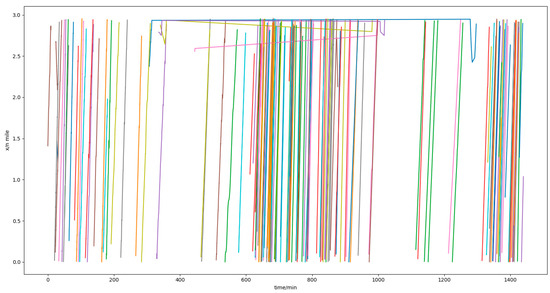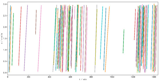 The AIS trajectory data for ships entering the channel are extracted, with Y values ranging from 90 to 290 m. The spatio-temporal trajectory map of the ship in this subdivided shipping lane is shown by using the time series as the horizontal axis and the displacement of the ship in the X direction as the vertical axis. The resulting trajectory diagram is illustrated in Figure 8, Figure 9 and Figure 10.