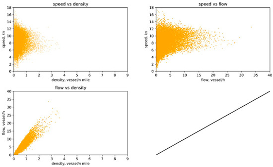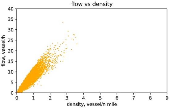Taking min, the characteristic of the traffic flow in the subdivided shipping lane with the value of the ships’ AIS data in the range of m were calculated and plotted, and the fundamental diagram of this shipping lane is shown in Figure 11.