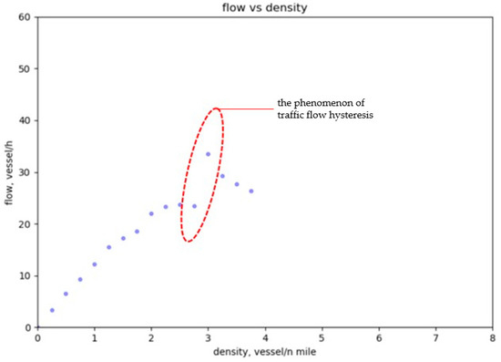 When analyzing Figure 12, depicting the link between traffic flow and density, researchers discovered that plotting the density separated by certain intervals and taking the maximum value of the traffic flow volume within the intervals will result in the phenomenon of traffic flow hysteresis [28]. In road traffic, the first half of the traffic flow where there is a point of traffic flow hysteresis is the free-flow portion of the traffic flow, and the second half of the traffic flow is the blocked-flow portion of the traffic flow. Hence, Figure 13 likewise substantiates the presence of analogous characteristics in waterway traffic flow, akin to the fundamental pattern of road traffic flow.