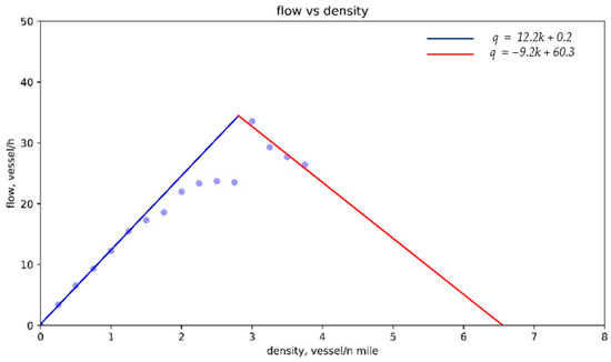 The least squares method was employed to fit the scattering points in both the free-flow and blockage sections of the scattering diagram. The least squares fitting relationship for the scattering points in the free-flow section can be expressed as follows: . Similarly, the scattering points in the blockage section can be fitted using the following relationship: . The obtained values for the free-flow velocity , about knots, and the blockage density , approximately 6.5 vessels per nautical mile, are presented in Figure 14.
