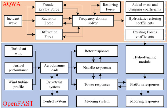Subsequently, aerodynamic loads, hydrodynamic loads, structural flexibility, and the servo control system are all taken into account in OpenFAST(v3.4.1), as shown in Figure 1. This is another important part during the motion analysis process. OpenFAST is a typical aero-hydro-servo-elastic coupling framework and uses Kane’s method to solve the equations [32]. It takes into account the impact of the control system, and the solution results are more realistic [33]. Additionally, the finite element method (FEM) is utilized to account for the elasticity of the structure. The FWOT is calculated as a coupled system and the structural motion responses can be obtained.
