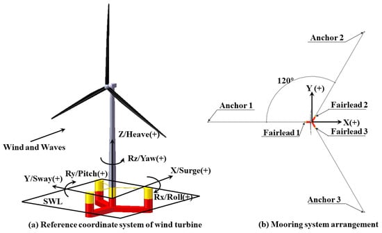 The arrangement of the mooring system is shown in Figure 2b. The mooring system, designed for a water depth of 200 m, consists of three catenary chain mooring lines, with a horizontal angle of 120° between two chains. The diameter of each mooring line is 185 mm, with a length of 837.6 m, and the fairlead is designed at a depth of 14 m below the SWL. Unfortunately, the chain is designed for strength based on the displacement boundaries (with a peak surge-sway offset of under 25 m), and fatigue strength was not studied. The properties of the mooring system are summarized in Table 3.