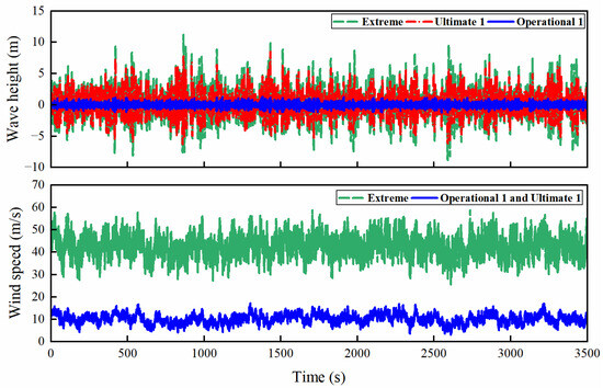 The wind and wave loads are designed based on the joint probability function, and current load is not considered in the analysis. Table 4 presents the selection of representative Design Load Cases (DLCs). The two-parameter JONSWAP spectrum is utilized to describe the waves [35], incorporating significant wave height (Hs) and wave spectrum peak period (Tp), with wind speed values in Table 4 representing the mean speed at hub height. Turbulent wind conditions are assumed in all scenarios, with the wind spectrum model defined as the IEC Kaimal spectral model. The Normal Turbulence Model (NTM) is adopted in DLC 1-2, while the Extreme Wind Speed Model (EWM), occurring once in 50 years, is utilized in DLC 3. The wind class is set as Class A, and turbulent intensity factors and other parameters can be found in IEC 61400-3 [36]. And the time history curve of wind speed and wave height are shown in Figure 3. In Figure 3, the relationships between time and wave height, as well as time and wind speed, are intuitively illustrated. The wave conditions in DLC 2 and 3 are significantly more severe compared to in DLC 1. Additionally, the wind speed under extreme conditions is approximately four times higher than that under the other conditions.