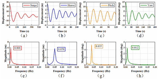 In Figure 4a, the time history curve of free decay shows a period of around 130 s in the surge direction, and its natural frequency is shown to be 0.008 Hz in the frequency domain in Figure 4e. In general, the free heave motion of the structure can also be used as part of the model’s validation [38]. And the period of the heave motion is approximately 20 s, corresponding to a natural frequency of 0.05 Hz in the heave direction, as shown in Figure 4b,f. Similarly, in Figure 4c,g, the period is around 30 s, and the natural frequency is 0.035 Hz in the pitch direction. In Figure 4d,h, the period is around 80 s, and the natural frequency is 0.012 Hz in the yaw direction. Comparison with the results from the reference [34] reveal a close consistency. The errors are all not greater than 0.001 Hz, which means the results are in good agreement with the reference data. Therefore, the constructed model is validated.