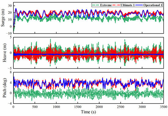 Transient effects can be observed in approximately the first 200 s and are not significant in the heave direction. The motion in all three directions starts from an initial position of 0 m. The most substantial change was observed in the surge direction, where the motion increased from 0 m to approximately 25 m under Ultimate 1 and Extreme conditions, and from 0 m to 15 m under the Operational 1 condition, before beginning to fluctuate. Similarly, in the pitch direction, the motion increased from 0 m to approximately 6 m under the Ultimate 1 and Extreme conditions, and from 0 m to 2 m under the Operational 1 condition, before beginning to fluctuate.