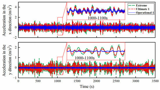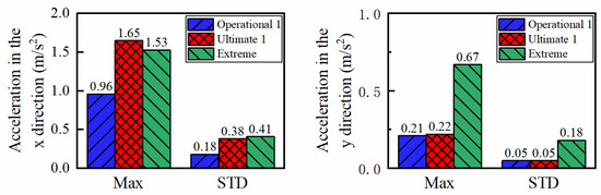 The acceleration of the nacelle has an important influence on the force exerted on the structure, and the nacelle acceleration responses serve as a reference for studying the tower responses. Therefore, the nacelle acceleration responses are obtained. Figure 6 presents the acceleration responses in the x and y directions, while Figure 7 displays the maximum (Max) values and standard deviation (STD) values of the response. The effects of transient phenomena are hardly noticeable in the acceleration response.