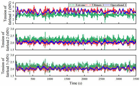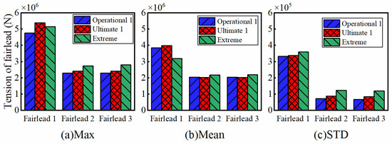 There is no doubt that the state of the mooring cable is particularly important for the safety of floating wind turbine structures. The force responses of three mooring lines can be calculated under different conditions. Figure 8 shows the time history curve of fairlead tensions, and Figure 9 shows the statistic characteristics of fairlead tensions.