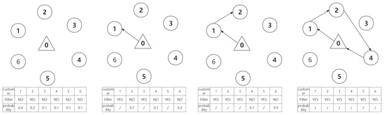 Figure 2, node 0 represents the base station, and nodes 1, 2, 3, 4, 5, and 6 represent the targets. Initially, start from 0. After filtering, all targets meet the constraint conditions. Then, calculate the selection probability based on Equation (