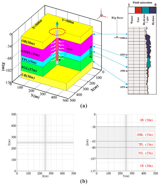 The SHSC4 well in the Shenhu Sea area was selected for the simulations (Figure 1) [45]. The NGH reservoir at this site belongs to Class 1-type, which consists of three parts: the gas hydrate-bearing layer (GHBL, contains water and hydrates, with thicknesses of 35 m); the three-phase layer (TPL, contains water, free gas and hydrates, with thicknesses of 15 m); and the free gas layer (FGL, contains water and free gas, with thicknesses of 27 m) [10,46,47]. A multi-layer reservoir model with a size of 500 × 500 × 137 m was constructed under the x-y-z coordinate system, as shown in Figure 2a. Ten simulation cases were simulated to assess the stepwise depressurization with different depressurization parameters, including a 70 m long vertical wellbore deployed at the center of the model (model’s −21 and −91 m). Table 1 gives the detailed parameters for these cases.