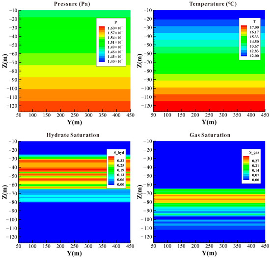 The model is divided into three subdomains: the GHBL, TPL, and FGL. The top and bottom of the TPL are considered as the boundaries of the hydrate interface (i.e., the three-phase conditions for the coexistence of hydrates, gas, and water). Each subdomain is simulated separately to determine the initial pressure, temperature, and saturation steady-state conditions; during the process, the heat flux between each subdomain is adjusted by fine-tuning the geothermal gradient. When the heat flux of the contact surface between the three subdomains remains consistent, the combination is performed to complete model initialization, as shown in Figure 3 [48,49,50,51,52,53].