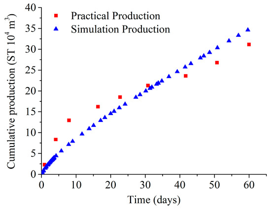 Based on China’s first offshore NGH testing data, a vertical wellbore was deployed at the model’s center with a completion length of 70 m [10,56,57,58,59]. Under the production pressure difference of 3 MPa, a 60-day gas production fitting was conducted to verify the model’s accuracy [10,56,57,58,59]. As shown in Figure 4, the fitting results are within the acceptable range.