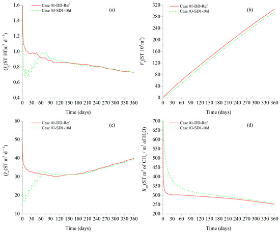 As shown in Figure 11, the depressurization gradients for Case 02, Case 03, and Case 04 are all set to 0.5 MPa, and the constant pressure durations are set to 20 days, 10 days, and 5 days, respectively. From Figure 11b, it can be seen that under the premise of a fixed depressurization gradient, the Vg decreases with the increase in constant pressure duration. The Vg after one year of production is 2.864, 2.966, and 3.019 × 106 ST m3, respectively. Compared with direct depressurization, it decreased by 6.28%, 2.94%, and 1.21%, respectively. As shown in Figure 11d, the Rgw increases with the increase in constant pressure duration. Throughout the entire production cycle, Case 02 has the best Rgw performance. Under the premise of fixed depressurization gradient and considering the Vg and Rgw, Case 03 is the optimal choice among them.