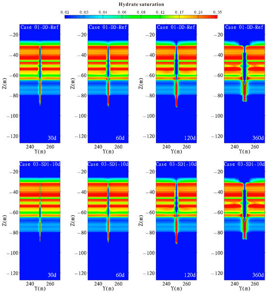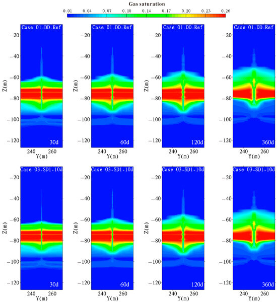 From Figure 9, it can be observed that as the hydrate dissociation in the GHBL and the free gas entered the wellbore in the TPL, both Case 01 and Case 03 formed gas at a relatively high saturation zone and gas at a relatively low saturation zone in the GHBL and TPL, respectively. In both cases, it can be observed that free gas moves upwards and downwards along the wellbore. The closer the free gas is to the wellbore, the faster it migrates, forming conical and inverted conical gas-bearing zones, respectively. After 120 days of production, the dissociation of hydrates located in the upper part of the TPL was observed in both Case 01 and Case 03, resulting in local high saturation gas accumulation around the wellbore.