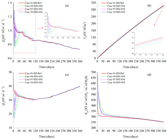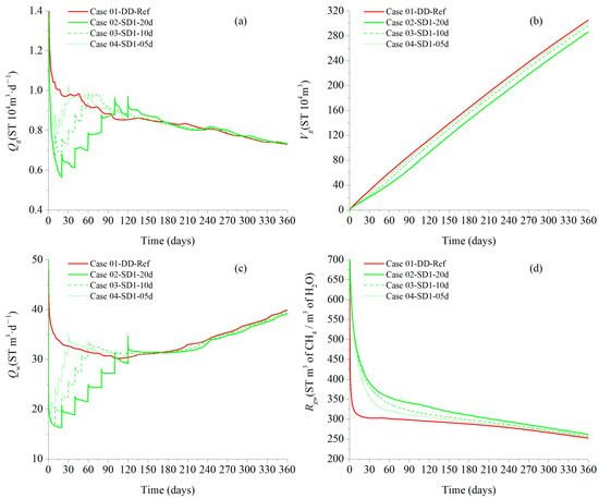 Gas and water production: (a) Qg curves; (b) Vg curves; (c) Qw curves; and (d) Rgw curves.