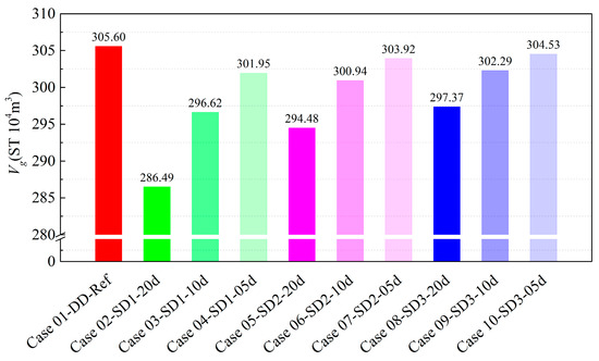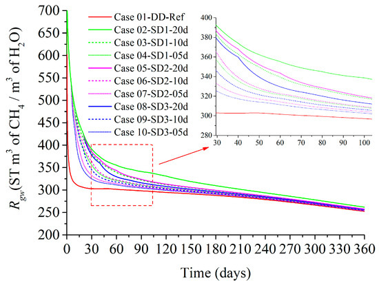 Figure 12 and Figure 13 show the Rgw and Vg for all simulated cases, respectively. Case 02 has the best Rgw performance, but its Vg of 2.864 × 106 ST m3 is the lowest among all stepwise depressurization cases, a decrease of 6.28% compared to Case 01. The Vg of 3.045 × 106 ST m3 in Case 10 is the highest among all stepwise depressurization cases, with only a decrease of 0.35% compared to Case 01, but its Rgw is the worst among all stepwise depressurization cases. The Vg of Case 03 is 2.966 × 106 ST m3, which is only 2.94% lower than Case 01. Its Rgw ranks among the top in all stepwise depressurization cases, and it is also easy to achieve stepwise depressurization with small depressurization gradients in engineering, making it the best choice in all cases.