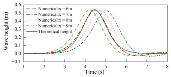 In the absence of the bridge structure, waves are generated in the computational domain using boundary velocity. The mesh division of the computational domain is as follows: the mesh of neighboring wave surfaces is encrypted to 0.02 m, while the mesh of the air and deep-water domain is set to 0.05 m. The change in the wave surface over time is monitored using the iso-surface method at a location of x = 6, 7, 8, 9 m from the inlet boundary. The still water level (SWL) of 1.76 m and wave height of 0.54 m serve as examples. As shown in Figure 2, the wave profile of the numerical simulation closely aligns with the theoretical solution, maintaining wave height errors within 2%, and no significant reflection interference phenomena were observed.