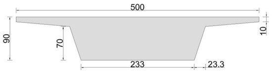 In order to make the simulation more typical, the box-girder bridge prototype is selected to be widely used in coastal areas with a narrower bridge deck and two-lane structure; the box-girder width is 10.2 m, the height is 1.8 m, and the base plate width is 4.5 m [20]. The numerical model adopts the scale of 1:10, and the specific parameters are shown in Figure 5.