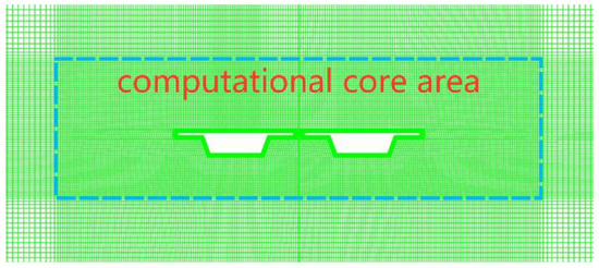 The computational domain is configured to be 24 m long and 3 m high, ensuring sufficient length for the full development of waves and minimizing the influence of the outlet boundary on wave reflection. In the computational domain of twin box-girder bridges, the bridge initially contacted by the waves is termed the twin forward bridge (deck), while the subsequent one is known as the twin backward bridge (deck). The single bridge is positioned identically to the twin forward bridge, located at x = 7 m from the entrance boundary, with the distance from the fixed bridge floor to the bottom of the computational domain set at 1.58 m. To enhance computational efficiency, the mesh in the core region of structural computation is refined, with the computational core area set as 0.02 m, while in other areas, it is set as 0.05 m. Wall encryption is implemented at 0.002 m to maintain Y+ within 50, as depicted in Figure 6. The time step is set to 0.002 s, ensuring that the maximum Courant number is around 0.25.