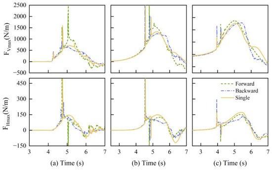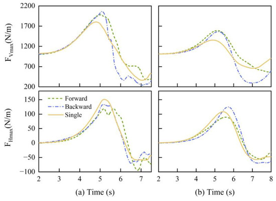 When 1 ( 1.76 m) and the bridge deck is fully submerged, as shown in Figure 9a, the single bridge, forward bridge, and backward bridge exhibit the same vertical force time history before reaching their peaks. The single bridge reaches its maximum quasi-static vertical force first, followed by the forward bridge and then the backward bridge, which has the highest peak value. The maximum vertical force experienced by the backward bridge is 15% greater than that experienced by the single bridge, while the maximum vertical force experienced by the forward bridge is 10% greater than that experienced by the single bridge. Furthermore, the maximum horizontal force of the single deck still surpasses that of the twin bridges, but the maximum horizontal force of the backward bridge exceeds that of the forward bridge, and a bimodal phenomenon occurs. This bimodal phenomenon is attributed to the increased rate of the increase in the negative horizontal force, which reaches its maximum at the lowest point of depression. Subsequently, with the arrival of the crest of the wave at the back deck, the positive horizontal force increases again, as shown in Figure 8b. The maximum horizontal force is 22% less than that of the single bridge for the forward bridge and 12% less than that of the single deck for the backward bridge.