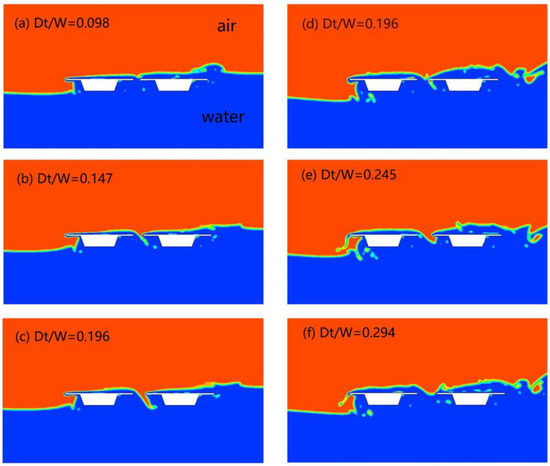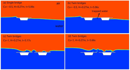 According to the horizontal force curves, initially, the maximum horizontal force on the single bridge increased under the four wave heights. For = 0.45 m, 0.54 m, it began to decline continuously after = 1, while for = 0.27, 0.36, it reached the maximum value at = 0.5. In comparison, the change in the horizontal force of the forward deck was smaller from = −0.5 to 0.5. A steady state appeared in all wave heights from = 0 to 0.5, followed by a sharp decrease, but overall, it also decreased with the increase in the submergence coefficient. The horizontal force curves on the forward bridge for = 0.27 m, 0.36 m exhibited fluctuations; for = 0.45 m and 0.54 m, there was a significant increase from = 0.5 to 1. In comparison with the single bridge and the forward bridge, the backward bridge did not exhibit a significant decrease in the horizontal force after = 0.5. This phenomenon is attributed to the water pressure caused by the trapped water between the twin bridges, as shown in Figure 11.