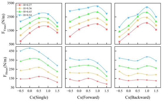 When Cs = 0.5, 1, 1.5, all instances exhibited significant negative horizontal forces. Specifically, at = 0.5, the maximum negative horizontal force exceeded 17% of the maximum positive horizontal force at = 0.147 due to the drop in the water level following the passage of the wave, whereas at Cs = 1, this figure only exceeded 3%, and when = 1.5, it surpassed 23% of the maximum positive horizontal force at = 0.098, as illustrated in Figure 18. In the same operational scenario, the maximum negative horizontal force did not exceed the maximum positive horizontal force on the single bridge.