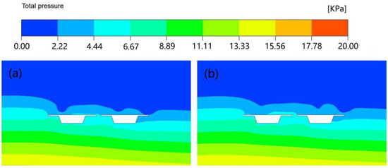 Comparison of total pressure snapshot when (a) twin forward bridge and (b) twin backward bridge reached maximum horizontal force (scale = 0.52).