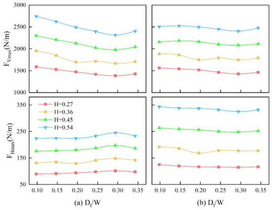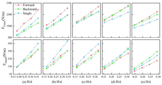 The analysis of the maximum horizontal force, shown in Figure 12, reveals that the twin bridge exhibits a smaller maximum horizontal force compared to the single bridge. Notably, there is minimal disparity between the maximum horizontal force of the forward bridge and the backward bridge before = 1. However, when = 1 and = 0.54 m, the maximum horizontal force of the backward bridge surpasses that of the single bridge. Subsequently, when = 1.5, the trapped water between the twin bridges exerts increased water pressure, causing the horizontal force on the backward bridge to consequently be significantly greater than that on the single bridge.