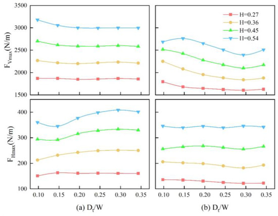 When = 0, the maximum vertical force on the forward bridge exhibited a steady decreasing trend. For = 0.54 m, there was a 4% decrease in vertical force from = 0.098 to 0.343, while for = 0.45, there was a 17% decrease during the process. Meanwhile, the maximum horizontal force on the forward bridge showed a slow increase with the spacing until it started to decrease at = 0.294. The backward bridge experienced an increase only at = 0.147, followed by a gradual decrease.