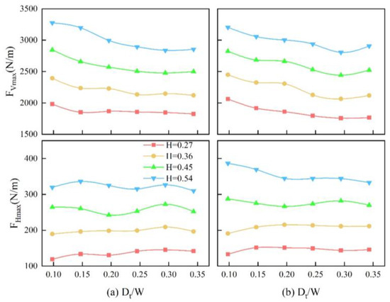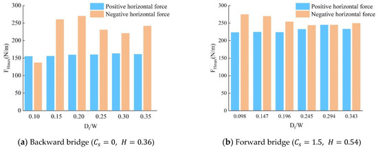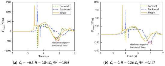When = −0.5, for = 0.54 m, the maximum negative horizontal force surpasses the maximum positive horizontal force on the twin forward bridge. Additionally, at = 0.098, it surpasses the maximum positive horizontal force by 12%. As shown in Figure 16a, although the negative horizontal forces of the single bridge and twin forward bridge are similar, the positive horizontal force of the twin forward bridge is relatively low. This results in a small difference between the positive and negative horizontal forces for the single bridge, while for the twin forward bridge, the negative horizontal force is greater than the positive horizontal force.